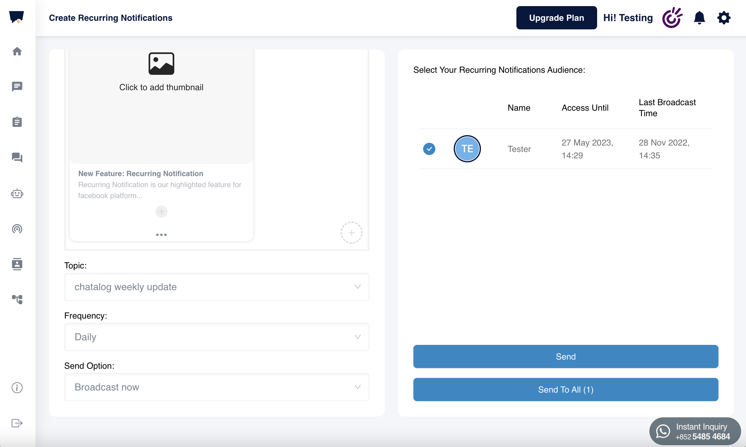 Finally, you can choose to broadcast now or schedule the broadcast. And then decide whether to select specific audience to send or click "Send To All".&#x20;