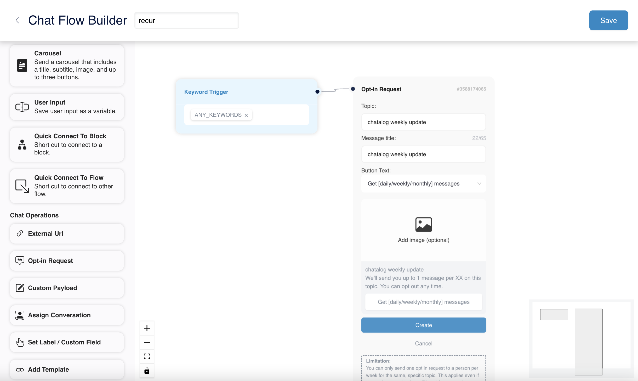 In the flow, set up a keyword that would trigger this opt-in request. If you wish your contact to trigger this flow despite whatever input, you can set "ANY\_KEYWORDS". Then you can drag the "Opt-in Request" block from the left and connect it to the trigger.