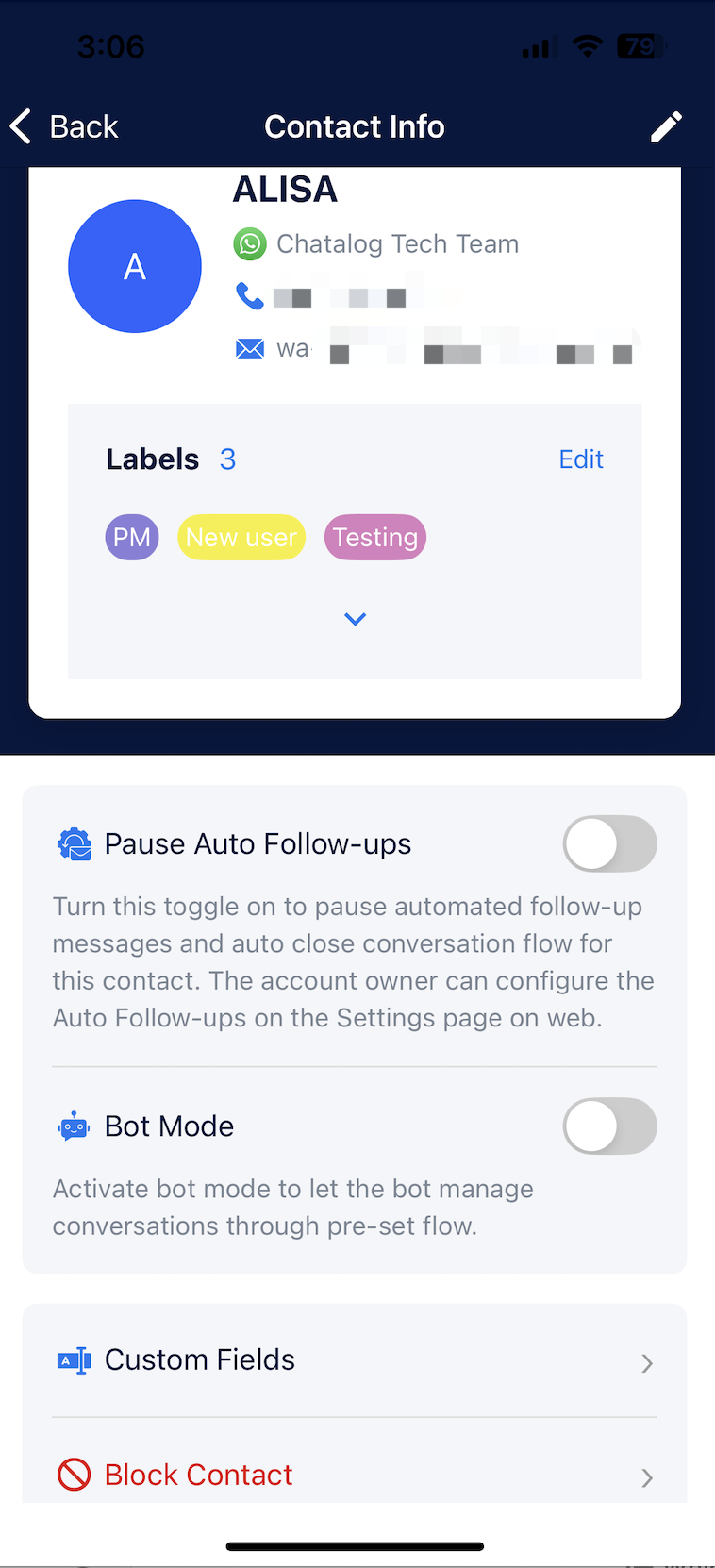 Enabling this toggle will pause automated follow-up messages and the auto-close conversation flow for this contact.