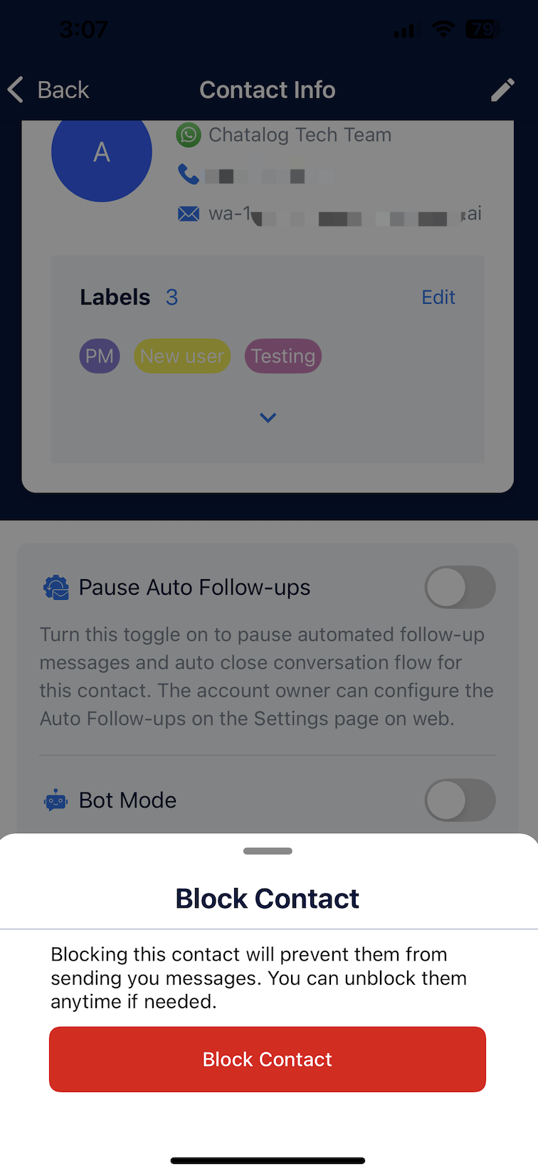 You can block or unblock this contact. Note that blocking a contact will prevent them from sending you messages.