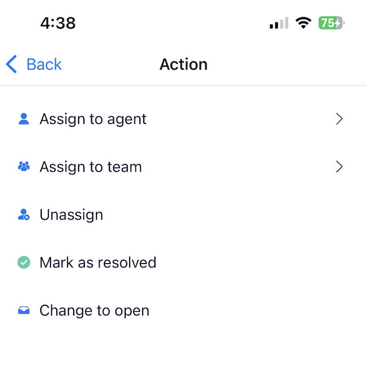 Click "Select" to choose multiple conversations, then click "Action" to assign them to a specific agent/team or mark them as Unassigned, Resolved, or Open.