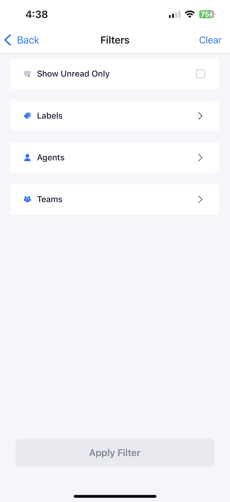 Click the filter icon to view unread conversations, conversations with specific labels, or conversations assigned to specific agents/teams.