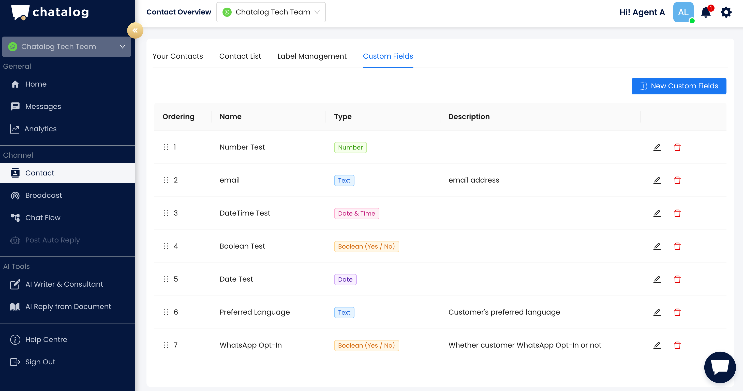Chatalog supports various types of custom fields to accommodate different data needs: