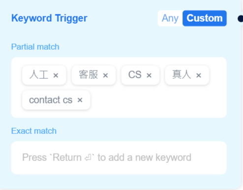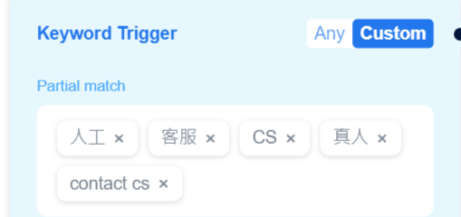 You can set **a custom keyword (partial match/full match)** or select **any keyword** to trigger the process.