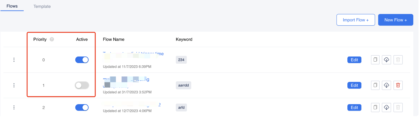 Each Keyword Flow has a priority in triggering. User input has a chance of containing more than one trigger keyword; at this moment, the flow has the highest priority among all the flows that have keywords contained in user input. You can drag flows at the left to alter their priority.