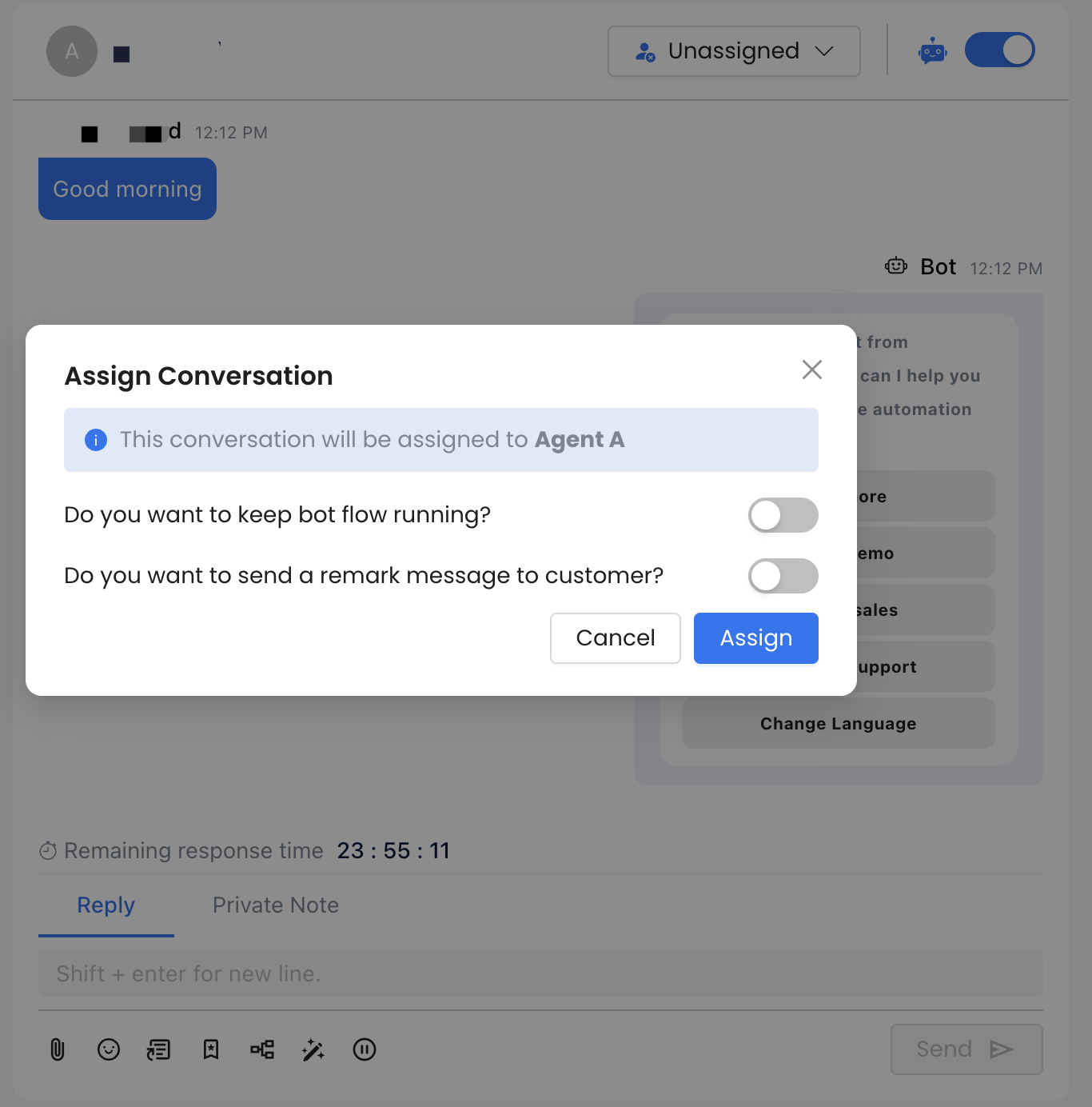 On the message page, you can assign a conversation to another agent or team by clicking the button shown in the picture below.