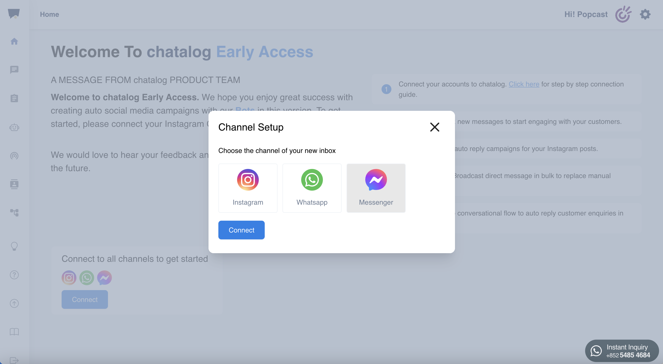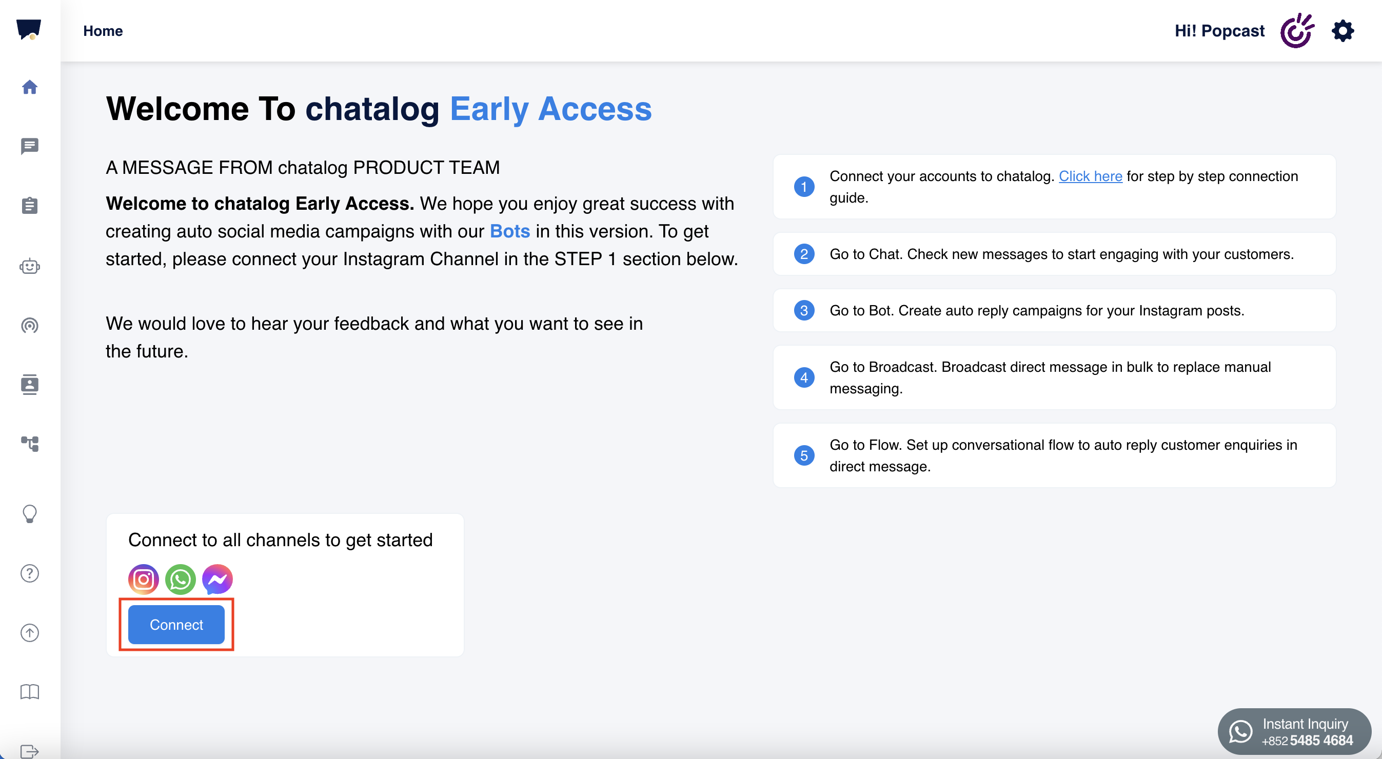 After finishing registration, [login to Chatalog](https://app.popcast.ai/signin). Click "Connect" on home page.