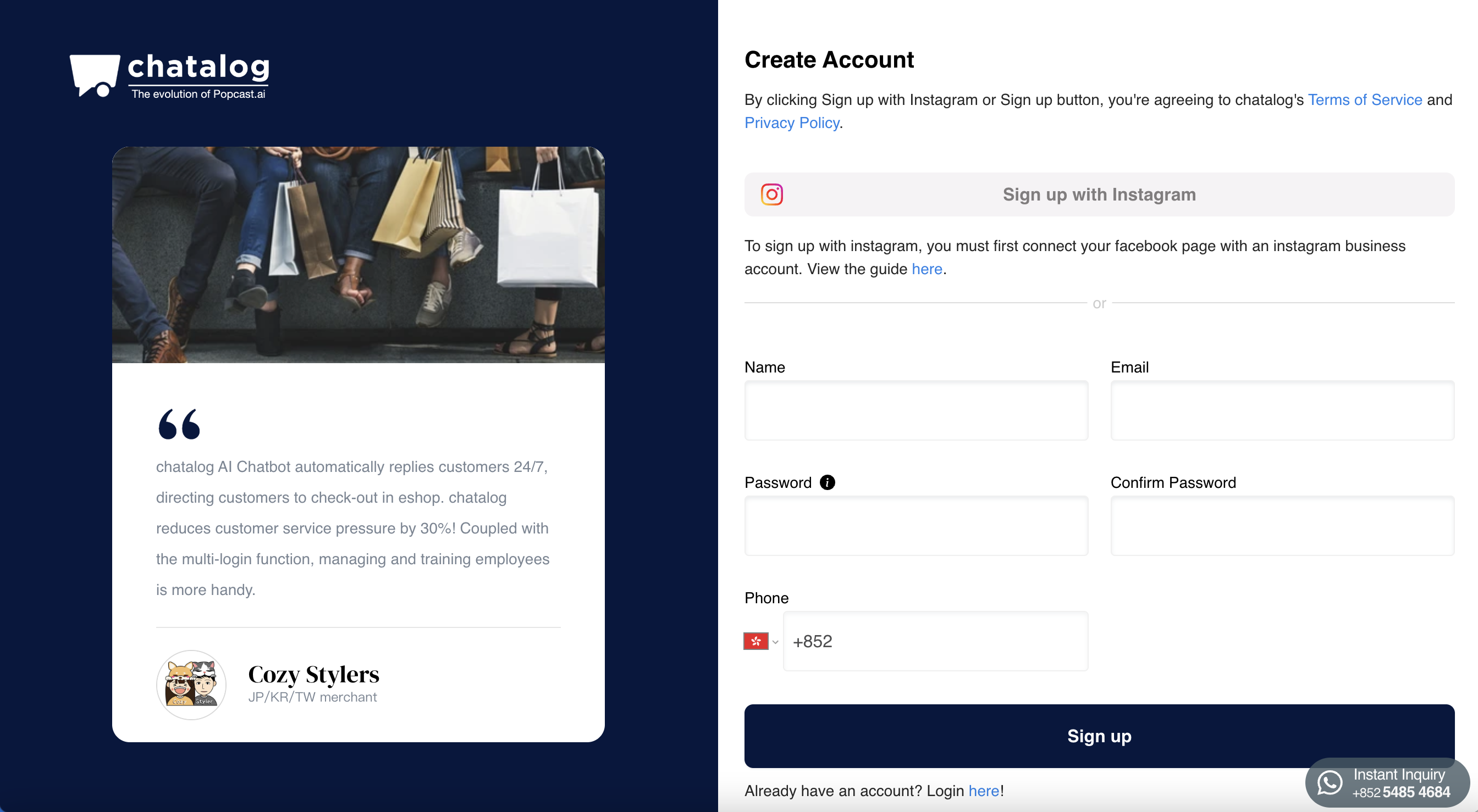 Sign up your Chatalog account [here](http://app.chatalog.ai/signup) by clicking "Sign up with Email". Simply fill in your name, email, password and phone number for finishing registration.