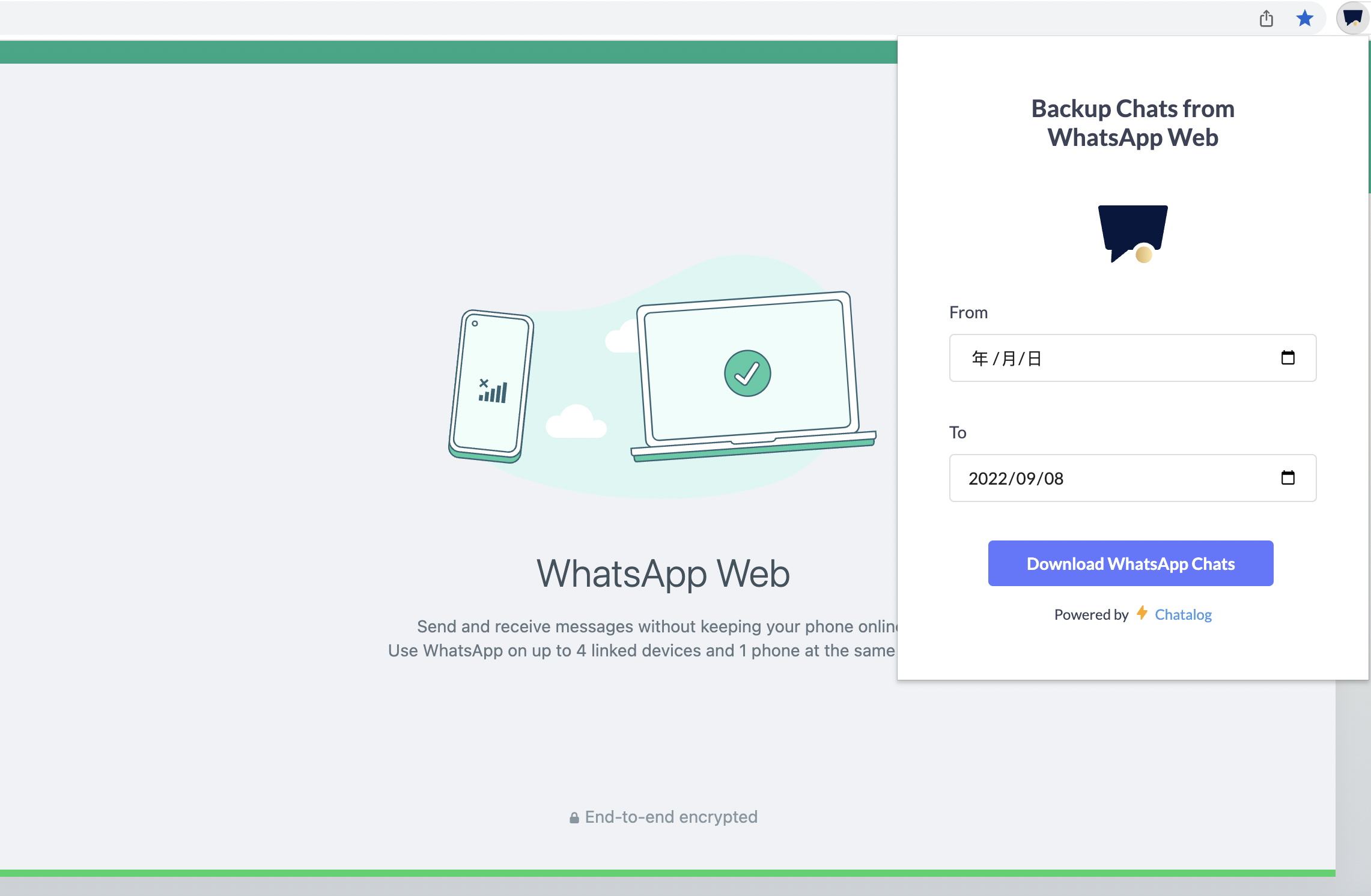 When your WhatsApp Web has connected with your account, click on the **Back up WhatsApp chat extension** again. You can select the date range that you want to export your conversations.