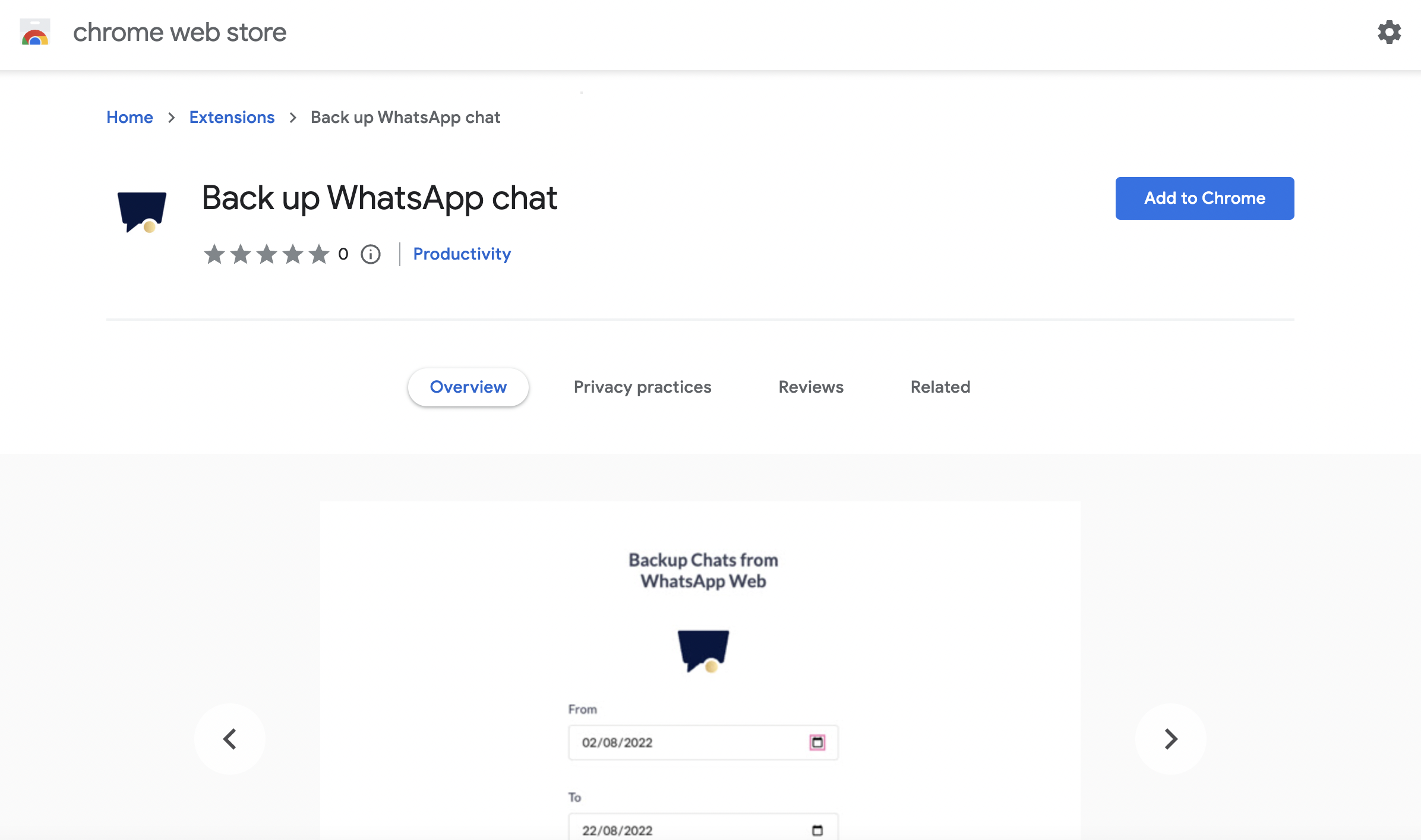 Click here to download [**Back up WhatsApp Chat**](https://chrome.google.com/webstore/detail/back-up-whatsapp-chat/hdplchlpchhjjbaejfpkbhklohcdlcbh) chrome extension.