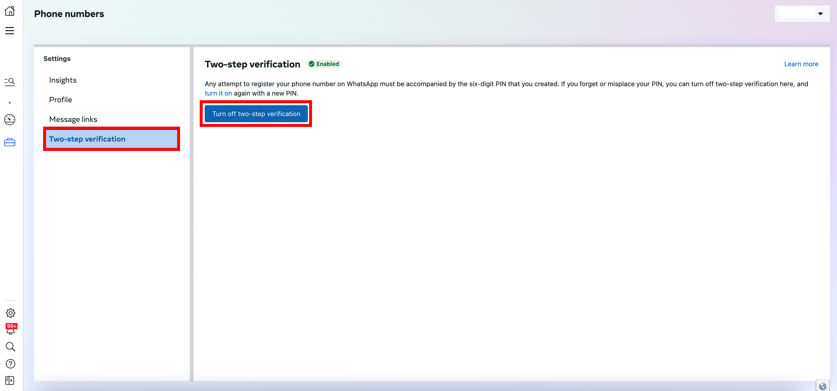 Turn off the two-step verification in WhatsApp manager is one of the most important steps in order to migrate your WABA number to Chatalog.