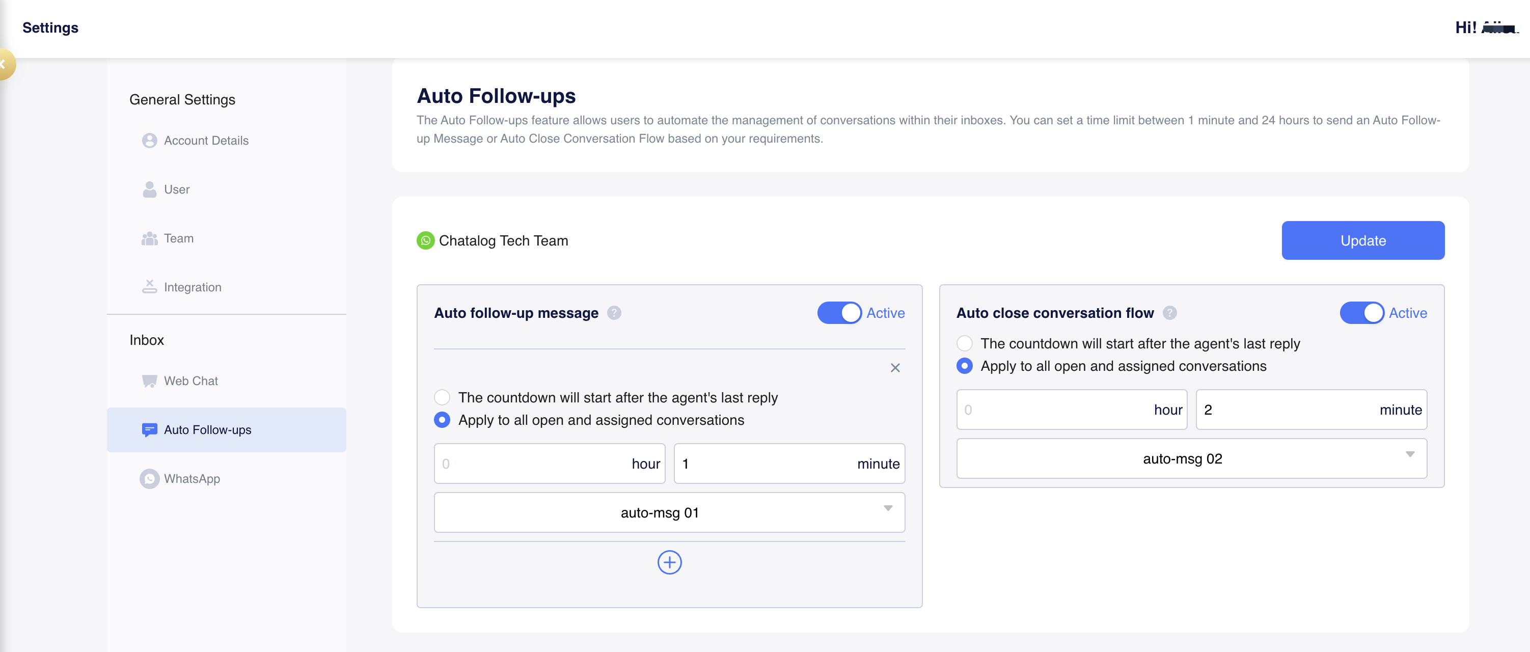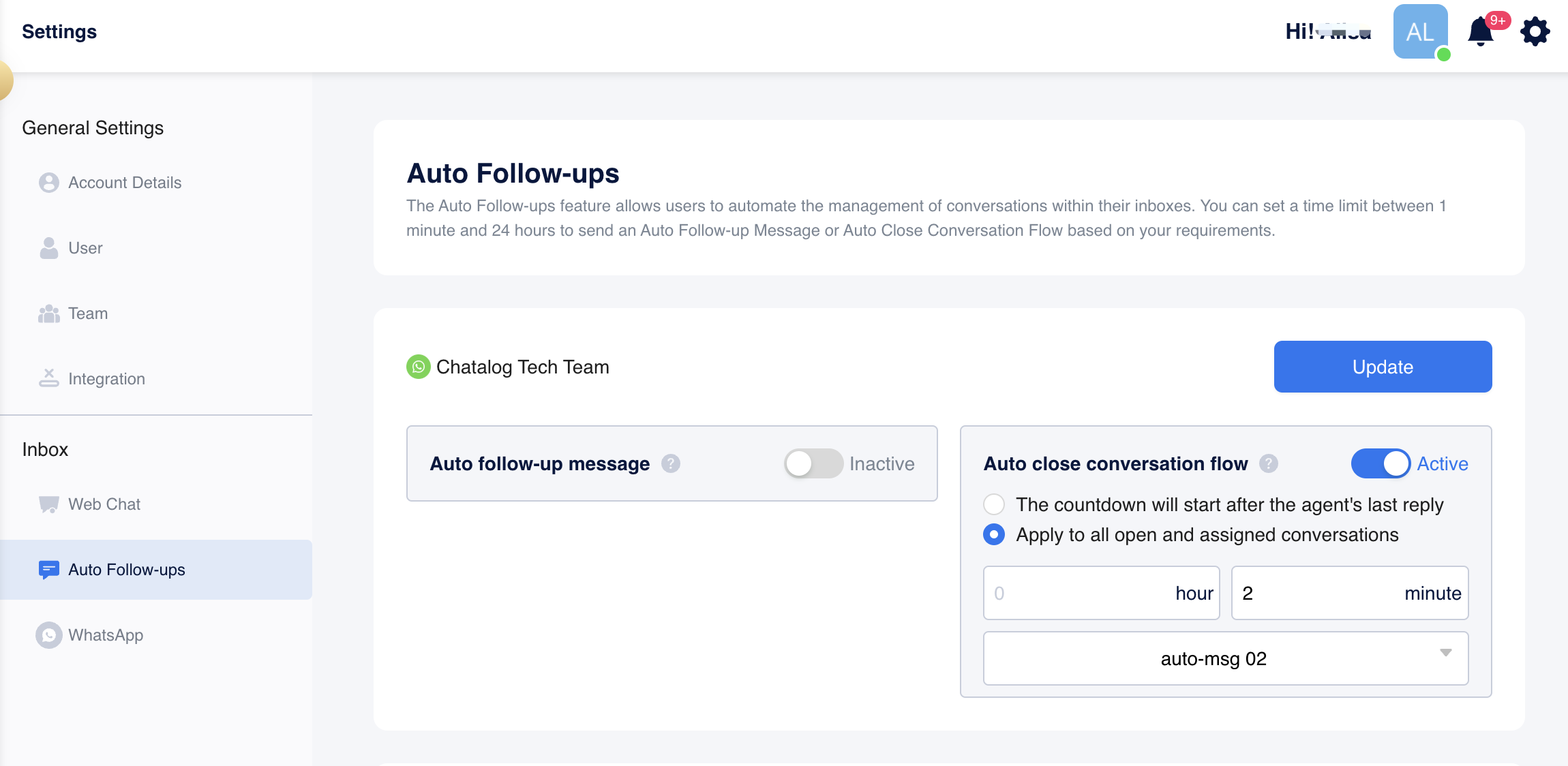 You can set a time limit between 1 minute and 24 hours to send an Auto Follow-up Message or Auto Close Conversation Flow based on your requirements.