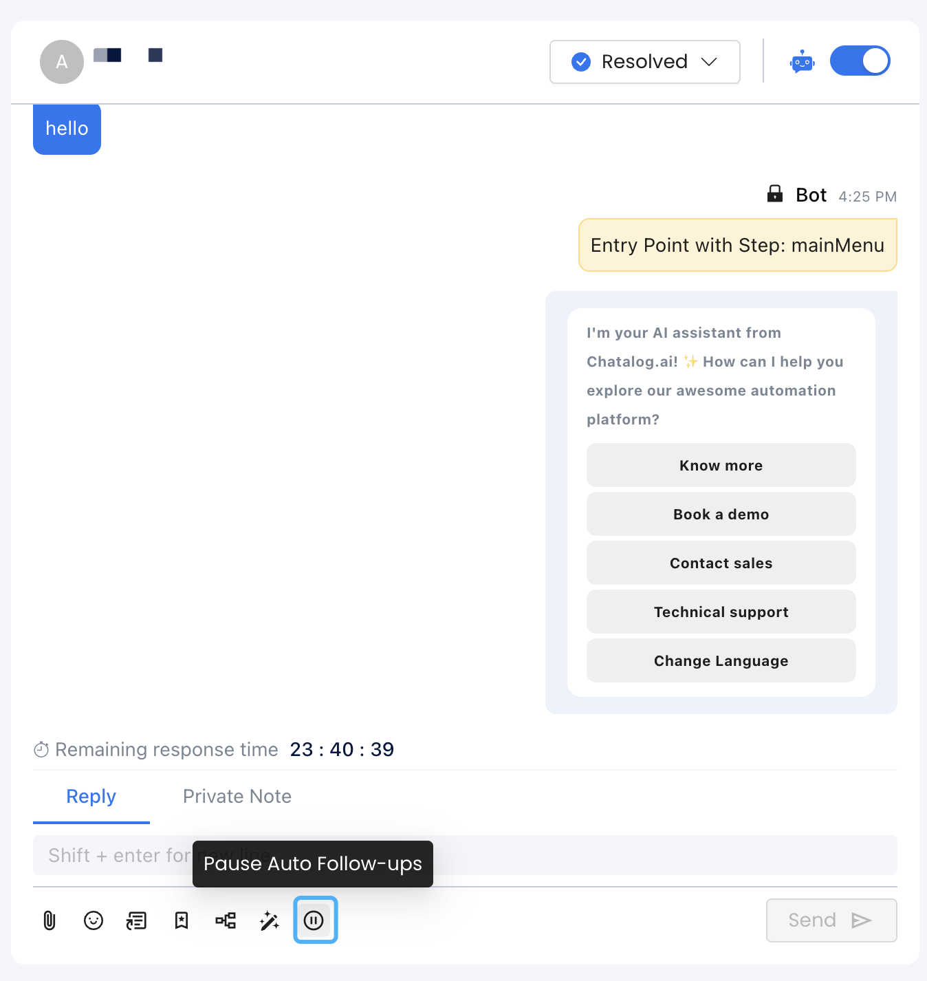 When you enable Auto Follow-ups for the entire inbox, you can still manually pause this feature for specific contacts on the message page. After pausing, that contact will not trigger the Auto Follow-ups feature.