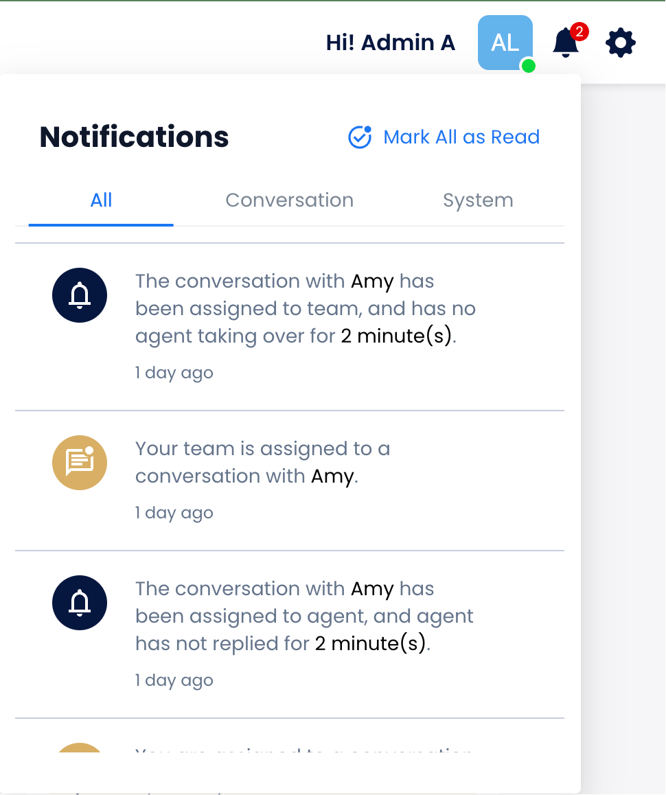 * **Agent Response Delay Alert:** Receive notifications when a conversation is assigned to an agent but the agent does not reply for more than a specified time period.