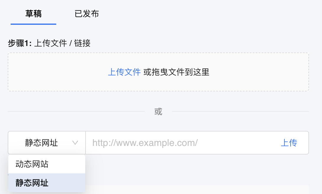 1. 如果您的内容托管在静态页面上，请选择"静态URL"选项。&#x20;