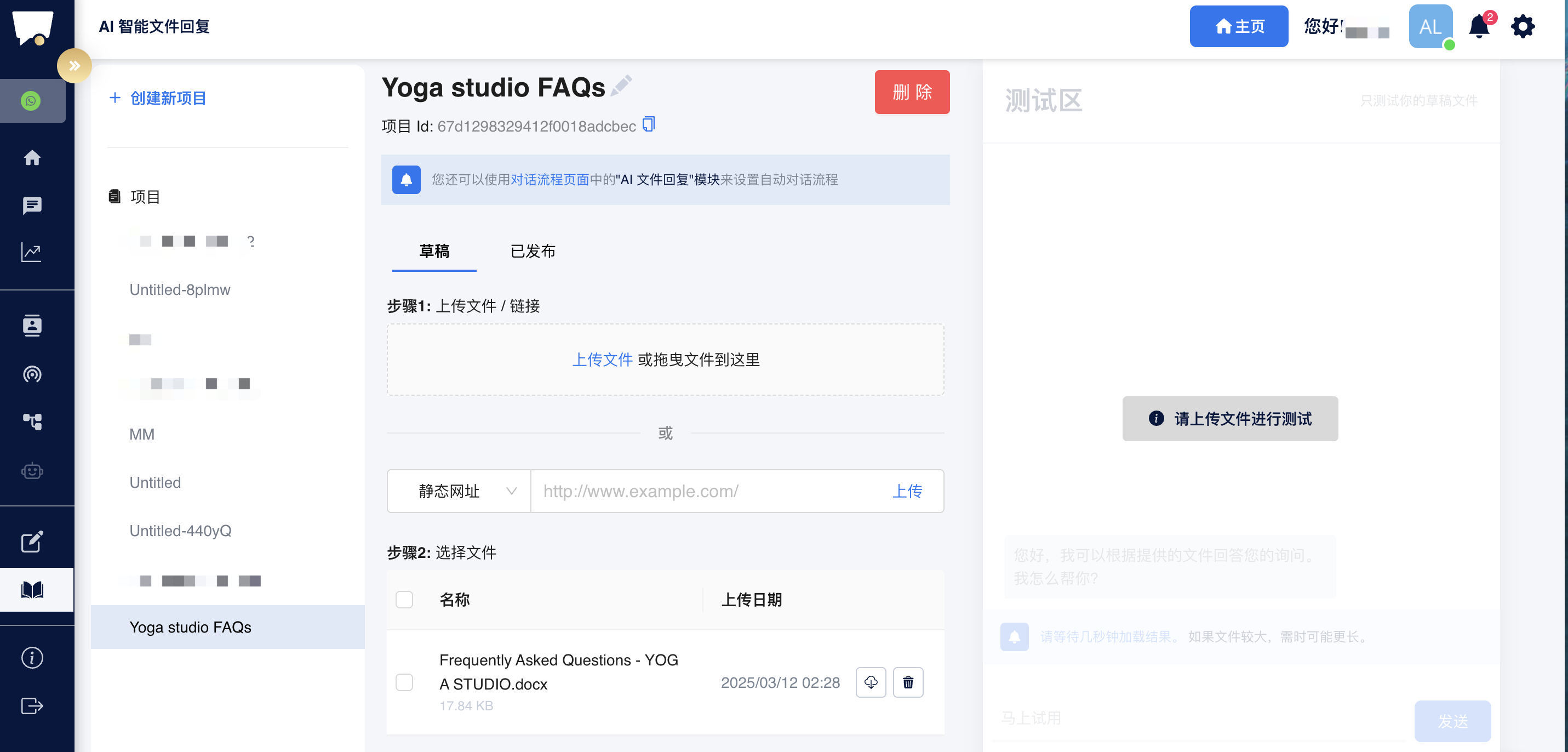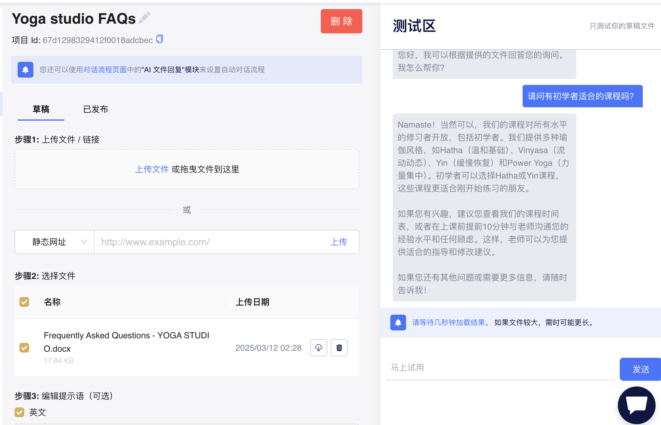 2. 您的文件现已发布，当您选择此项目时，AI将使用它在聊天流程中生成回复。