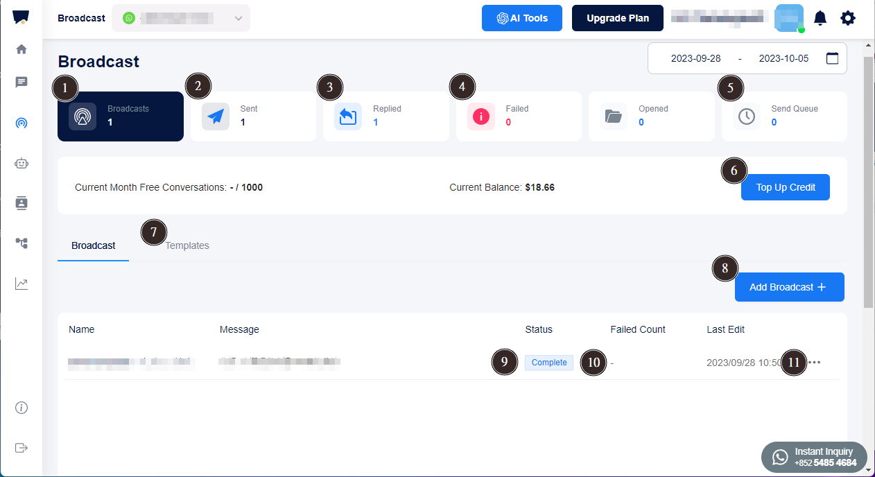 7. &#x20;建立范本Template的地方(用于群发broadcast/ 向客户打开24小时的自由对话时间) 新增/创造你将要发送的群发broadcast 群发发送的状态(你可检视发送的进度)&#x20;