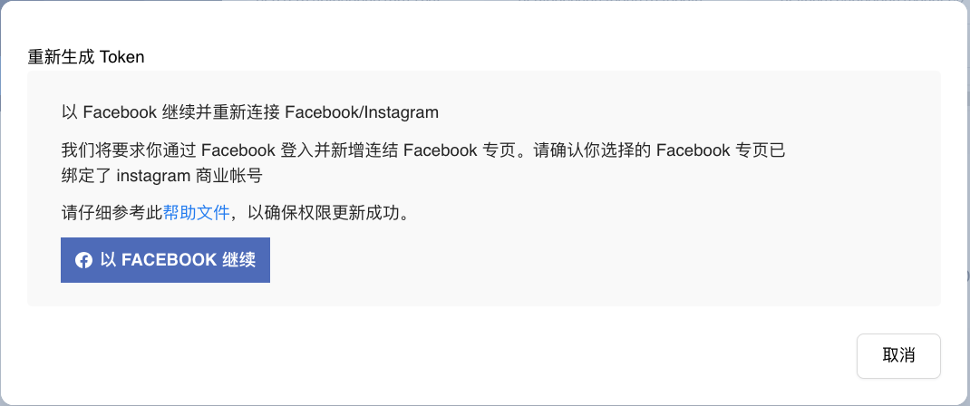 3\) 点击“以Facebook 继续”（如下图），我们将要求你通过 Facebook 登入并新增连接 Facebook 专页。如果是Instagram Inbox，请确认你选择的 Facebook 专页已绑定了 instagram 商业帐号。请选择允许所有权限。