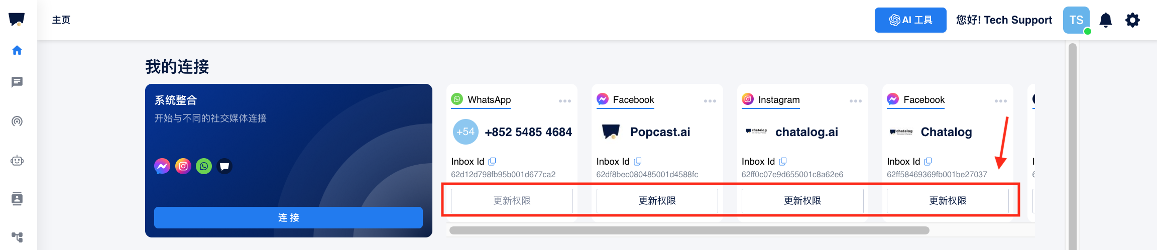 1\) 进入首页, 找到有问题的inbox，点击“更新权限“（如下图）