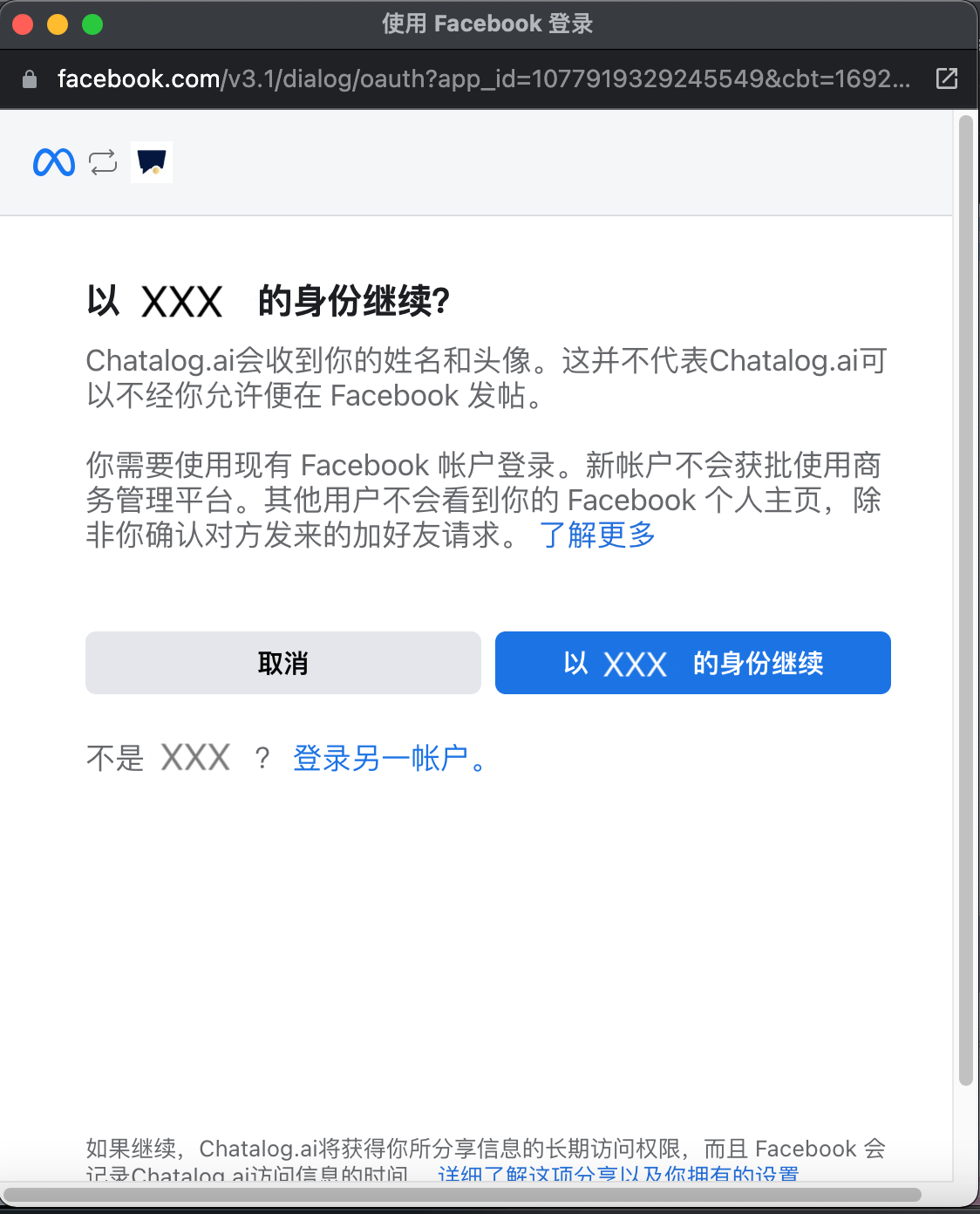 见到 Facebook 的弹出式视窗，点击「以xxx的身份」继续。