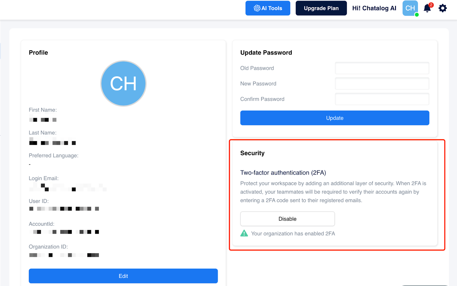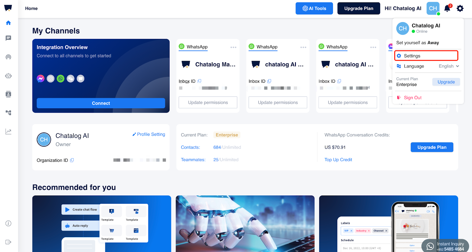 首先 ，账户拥有人要先[登入](https://app.chatalog.ai/)自己的账号 ，然后点击右上角头像的设定。<br>