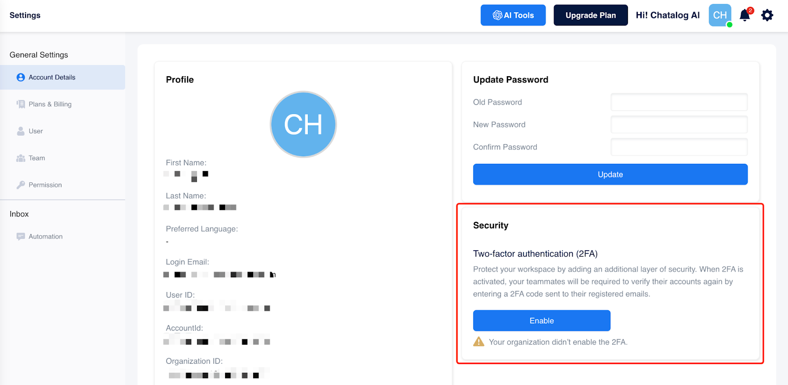 首先 ，账户拥有人要先[登入](https://app.chatalog.ai/)自己的账号 ，然后点击右上角头像的设定。<br>