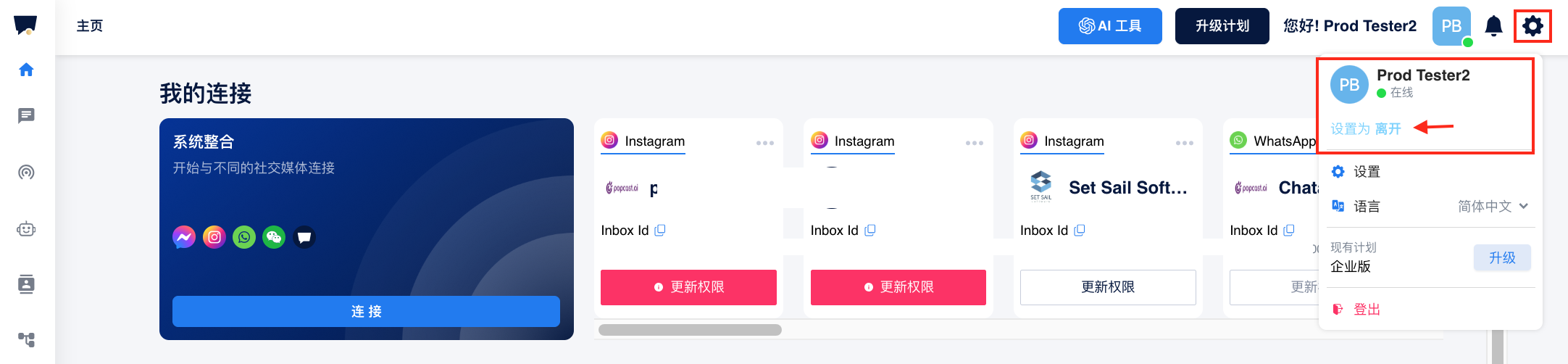 您可以单击**设置**图标。 它将显示您帐户的当前用户状态。 单击“设置为**离开**”或“设置为**在线**”以切换您的状态。&#x20;