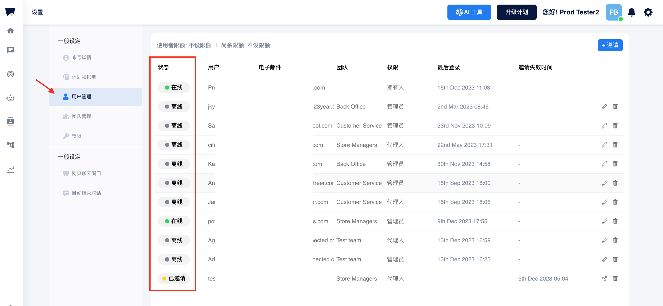 如果状态显示“**已邀请**”，则表示用户尚未接受在Chatalog 中加入你的团队邀请。 你可以单击发送图标重新发送邀请。