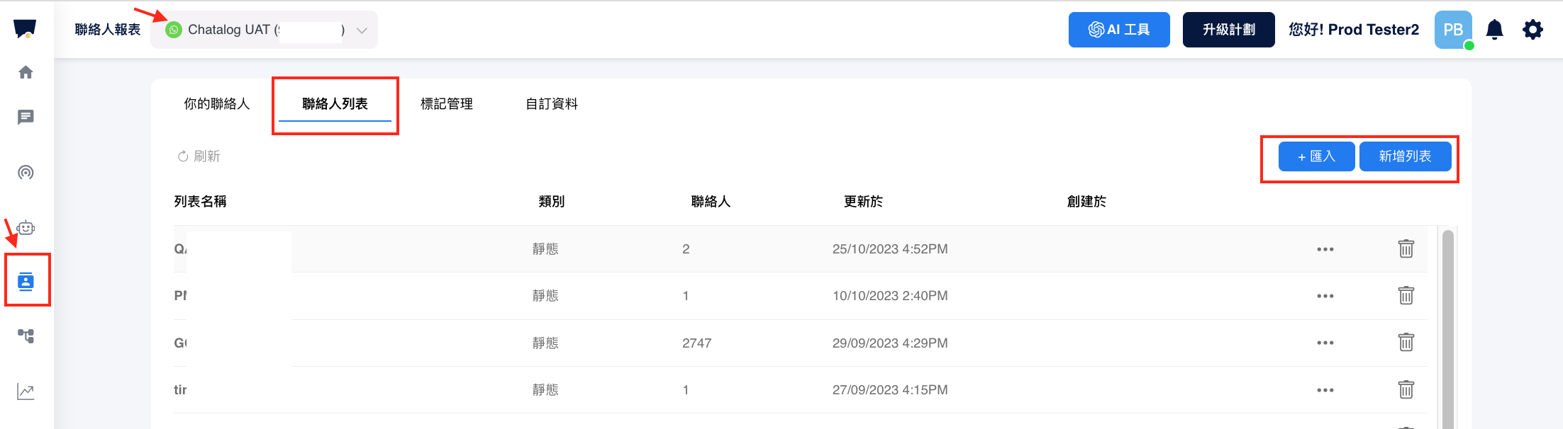 進入聯絡人頁面，點選“聯絡人列表”，選擇匯入或新增列表。