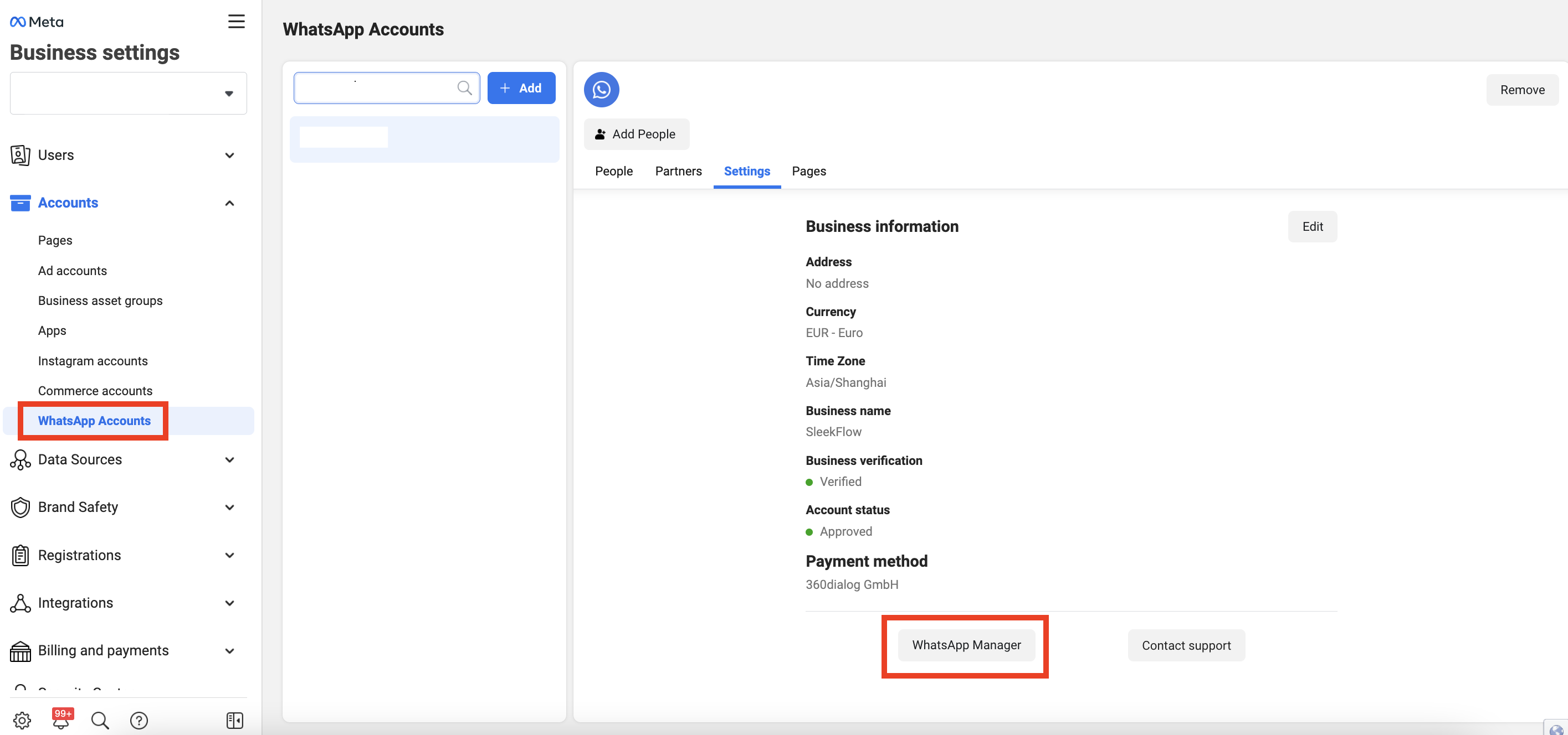1. 登陸 [**Facebook Business Manager**](https://business.facebook.com/) 。 前往 WhatsApp 帳號並點擊底部的 “<mark style="color:blue;">**WhatsApp Manager**</mark>” 。